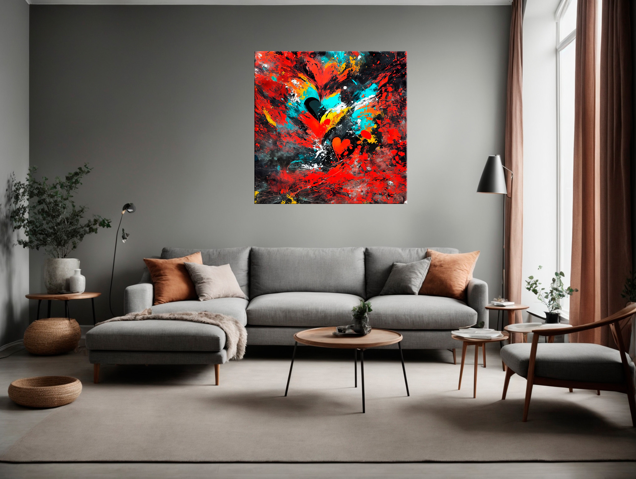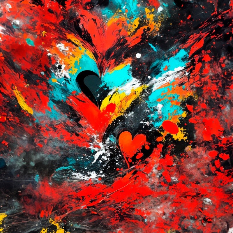 Taulussa avautuu abstrakti maailma, jossa punainen, turkoosi ja musta värittävät kankaan pintaan kuin tunteiden värikäs sävellyksenä. Keskiössä on sydän, joka sotkeutuu eri värien solmuun. Punainen hehkuu intohimoa ja rakkauden sykettä, turkoosi tuo mukaan rauhan ja viileyden, kun taas musta kuvastaa syvää ja mystistä tuntematonta. ”Sotkuinen Sydän” on enemmän kuin vain taulu seinällä; se on tarina elämän monimutkaisuudesta ja tunteiden kirjosta, joka täyttää jokaisen ihmisen sydämen. Se muistuttaa meitä siitä, että elämä voi olla sotkuista ja monimutkaista, mutta juuri siinä piilee sen kauneus ja syvyys.