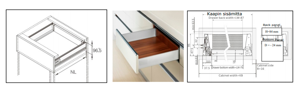 • Korkeampiin laatikoihin saatavilla reelinkisarja (valittavissa valikosta), joka tukee ovilevyn kiinnitystä.