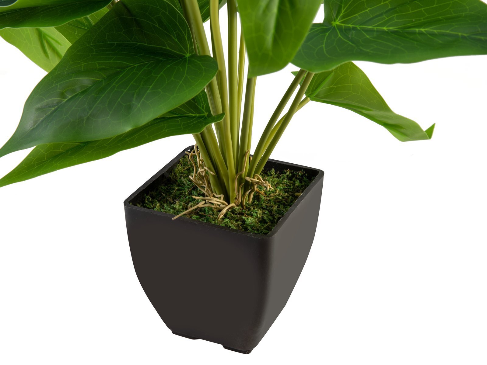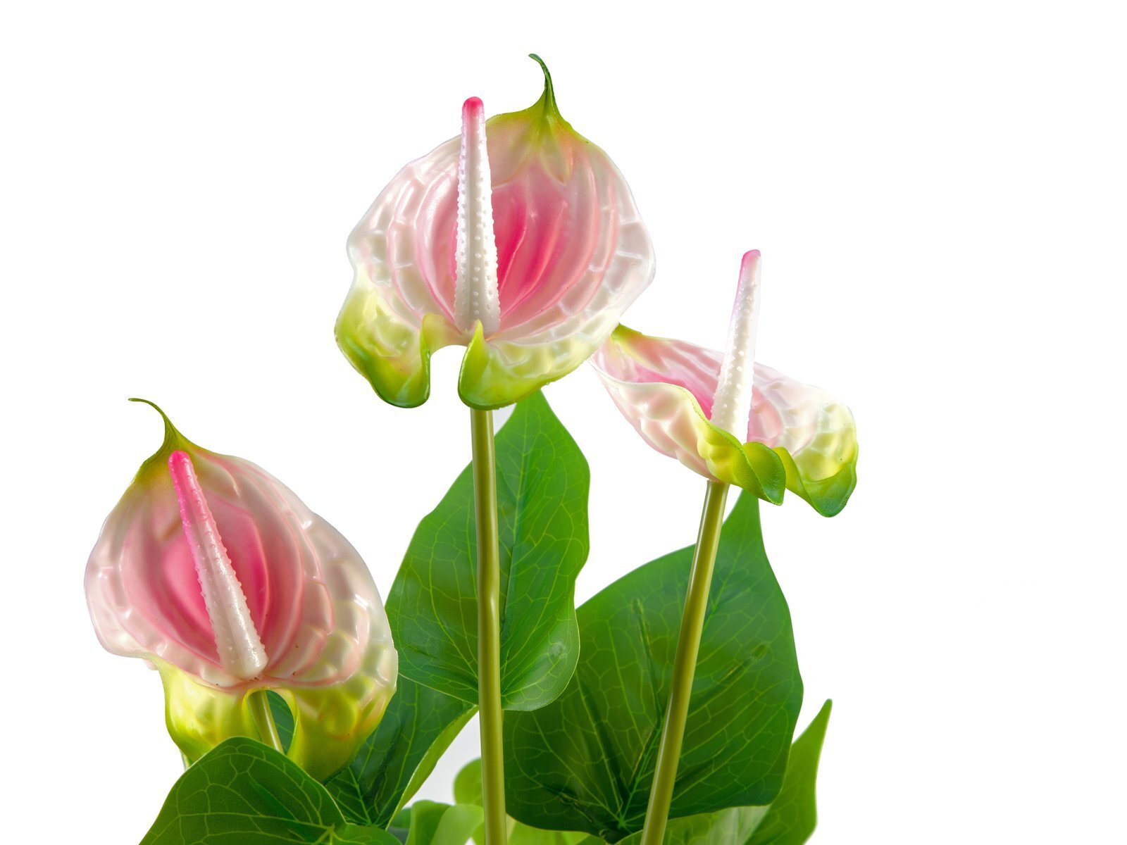 Luonnollisen näköinen, kaunis flamingokukka tekokasvi. Ihanat monisävyiset kukat ja luonnollisen sävyiset vihreät lehdet. Valmiiksi ruukkuun istutettu tekokukkakasvi on helppo asettaa haluttuun paikkaan.