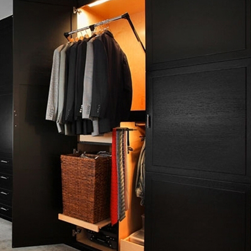 Hissivaatetanko mahdollistaa korkean yläkaapin käytön. Voit vetää tangon alas helpottaaksesi vaatteiden ripustamista tai poimimista ilman kurkottelua. Mekanismin leveys säädettävissä 875-1200 mm. Kantavuus 8 kg.