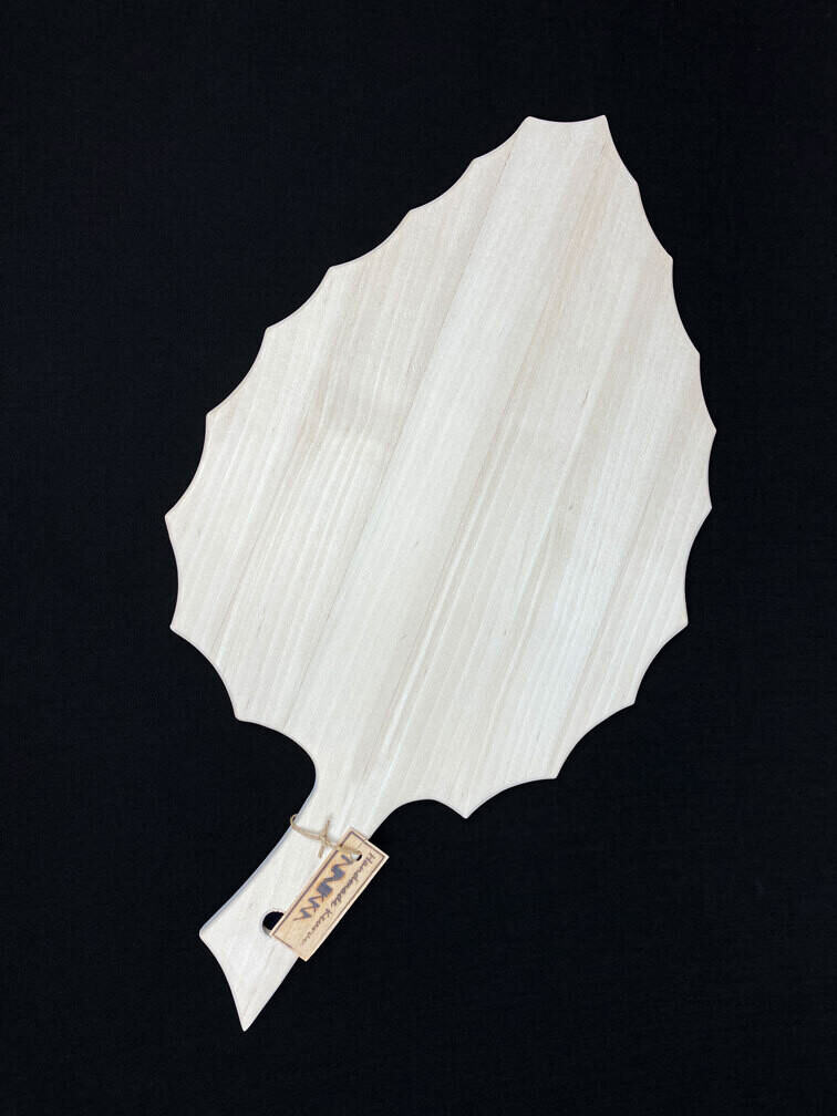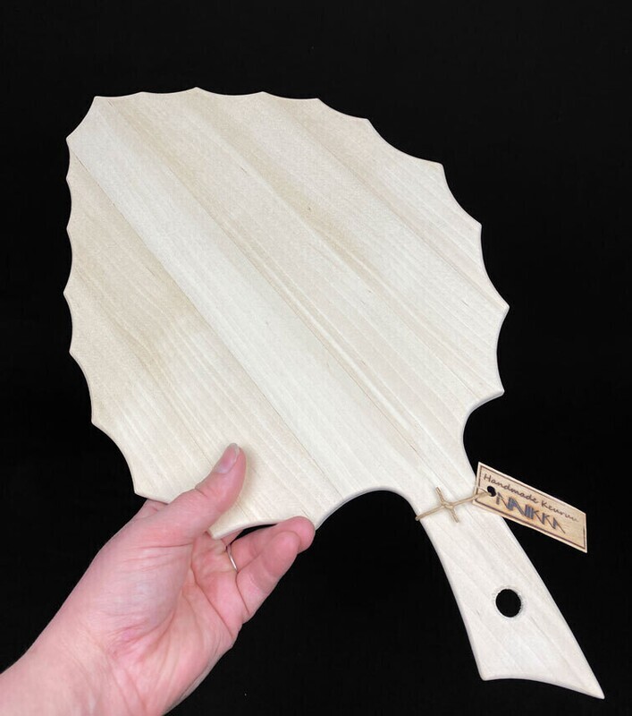 Upea lehden muotoinen, kotimaisesta puusta käsityönä valmistettu tarjoilualusta / leikkuulauta. Alustalle asetat kauniisti keksit, juustot, hedelmät, karkit, leikkeleet… Leikkuulaudalla leikkaat kaikki kasvikset, lihat, kalat…