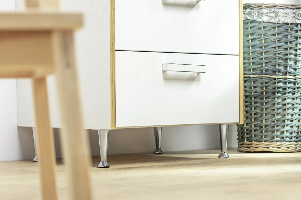 Jalan alapäässä on muovinen liukusuoja, joka ehkäisee lattian ja huonekalun pintojen naarmuuntumista. Lisäksi jalassa on 10 mm korkeussäätö, jolla tasaat helposti epätasaisen lattian ja varmistat kalusteen vakauden.