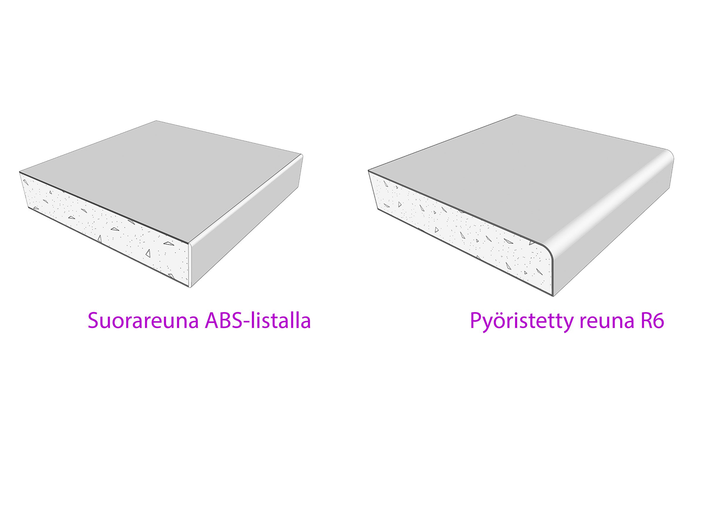 Tasot valmistetaan mittatilaustyönä juuri sinun mittojesi mukaan sekä reunavaihtoehtoja on valittavana suora ABS-reuna tai R6-taivereuna. Molemmat reunamallit viimeistellään tehdasolosuhteissa huipputarkalla koneistuksella, mikä takaa siistin ja pitkäikäisen lopputuloksen ilman repsottavia nauhoja tai irtoavia kulmia. Pinta on markkinoiden kestävin ja laadukkain.
