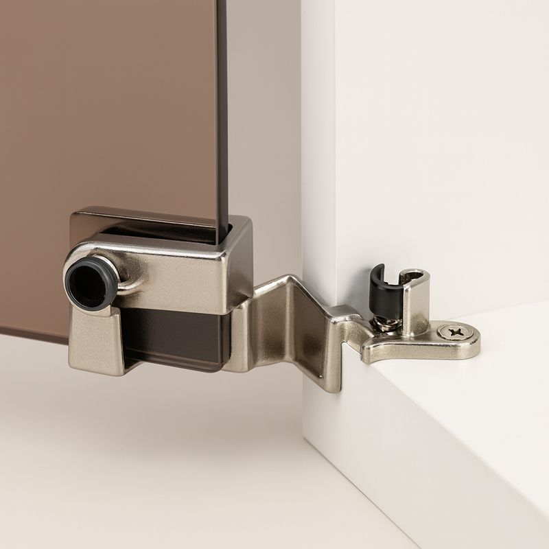 Lasi kiinnitetään liimatarran ja ruuvin avulla saranassa olevaan uraan – oviporauksia ei tarvita.