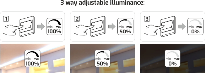 Hallitse valaistusta helposti ja tyylillä tällä laadukkaasti viimeistellyllä seinäkatkaisijalla! Säätimellä ohjaat LED-valojen valotehoa kolmella napsautuksella: 0% – 50% – 100%. Moderni ja siisti muotoilu tekee siitä täydellisen valinnan kodin tai toimiston valaistukseen.
