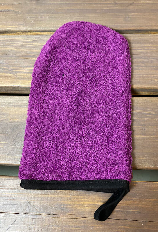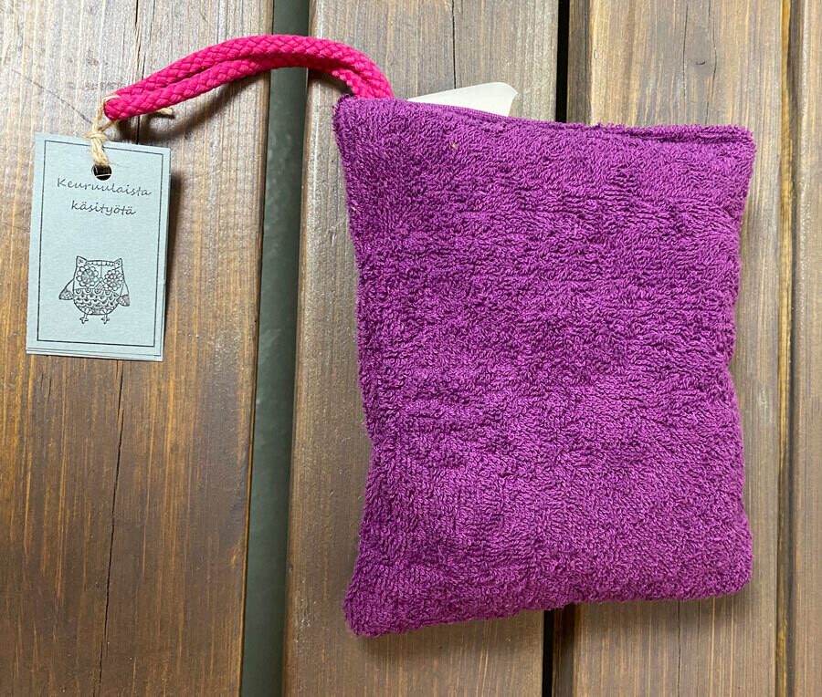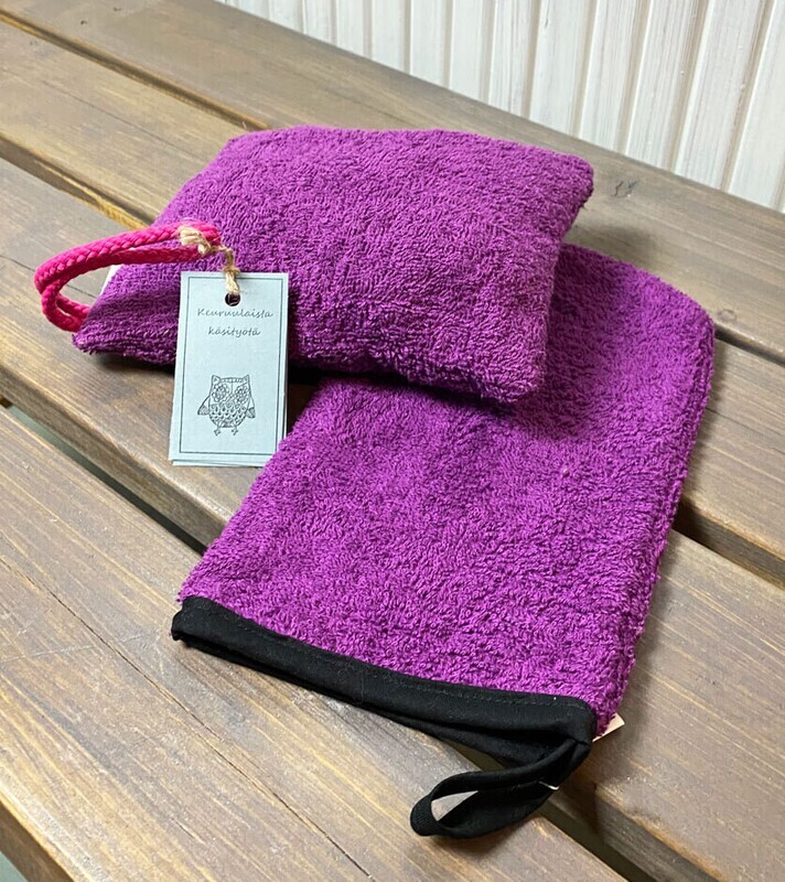 Ihanan violetin väriset pesukinnas ja pesutyyny. Froteekangas on mukavan pehmeän tuntuinen iholla, mutta samalla se myös pesee hyvin ihon puhtaaksi.