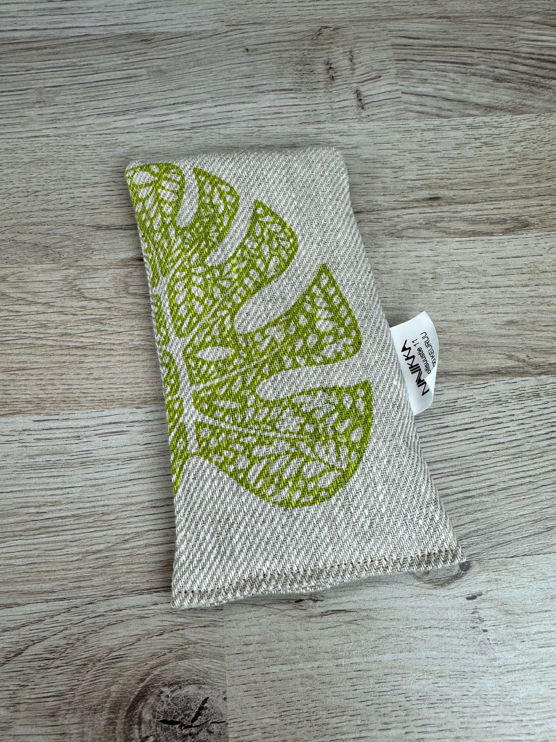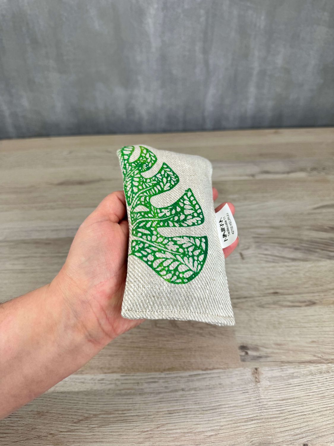 Kauratyyny – lämpötyyny kauniin vihreällä peikonlehden kuvalla. Lämpötyyny särkeville, jäykille lihaksille sekä kylmätyynynä esim. päänsärkyyn. Pienen kokonsa ansiosta tämä kauratyyny on todella monikäyttöinen ja se sopii hyvin myös hanskan sisälle lämmittämään sormia.