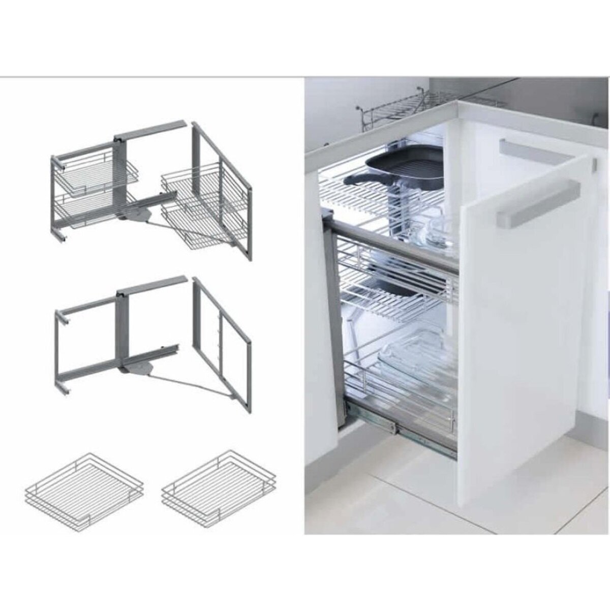 - Metallilankahyllyt: Mekanismin mukana tulevat kestävät metallilankahyllyt, jotka kestävät painoa ja tarjoavat helpon pääsyn kaapin sisältöön.