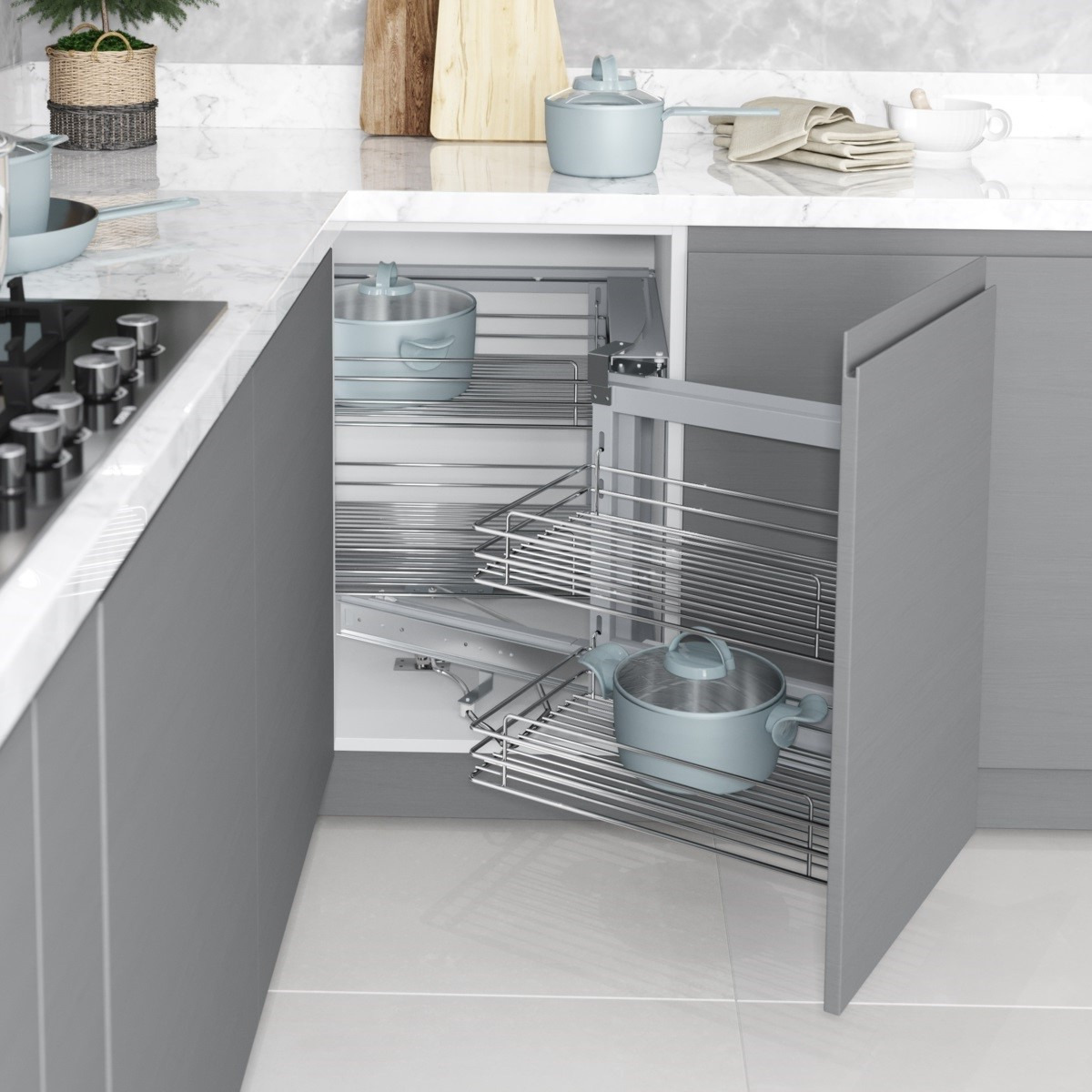 Tämä Hiipakan piilokulmakaapin mekanismi on suunniteltu kestämään ja helpottamaan kaapin sisällön käyttöä. Valitse laatu ja toiminnallisuus keittiöösi!