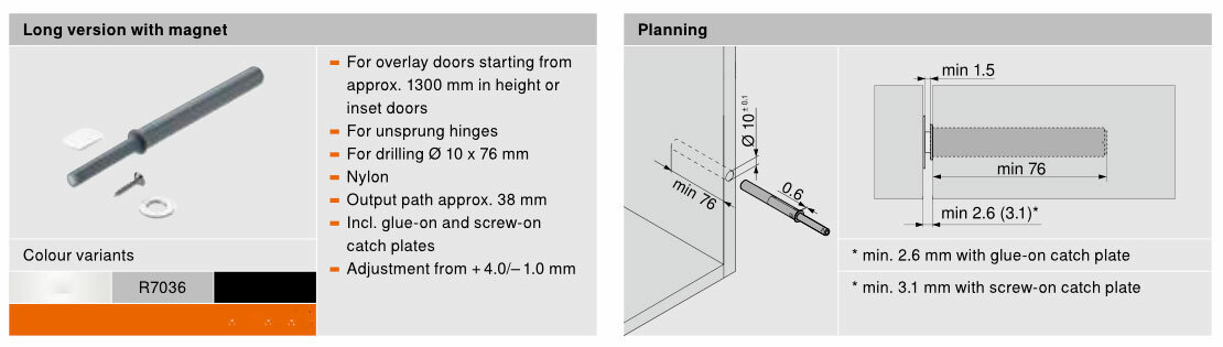 Haluatko saada kaapistosi tai nostomekanismit avautumaan yhdellä hipaisulla? Blum TIP-ON -mekaaninen avausjärjestelmä tekee tämän mahdolliseksi, olipa kyse sitten ovista tai nostomekanismeista. Sulkeaksesi, paina yksinkertaisesti kiinni. Paina ovea hiukan sisään ja päästä irti – ovi aukeaa raolleen. Paina ovea kiinni ja se jää kiinni asentoon. Toimii vain normaalien hidastamattomien saranoiden kanssa.
