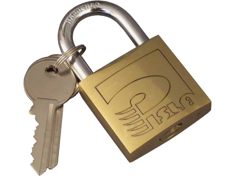 Messinkisen riippulukon sanka on karkaistua terästä, lukkopesä messinkiä ja mukana tulee kolme avainta.