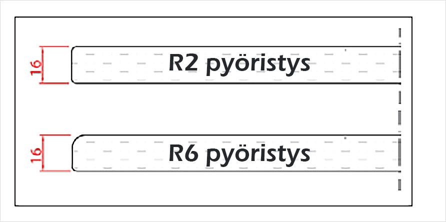 - Muotoilu: Sileä ovi, reunassa tyylikäs pyöristys r=2 mm tai 6=6mm