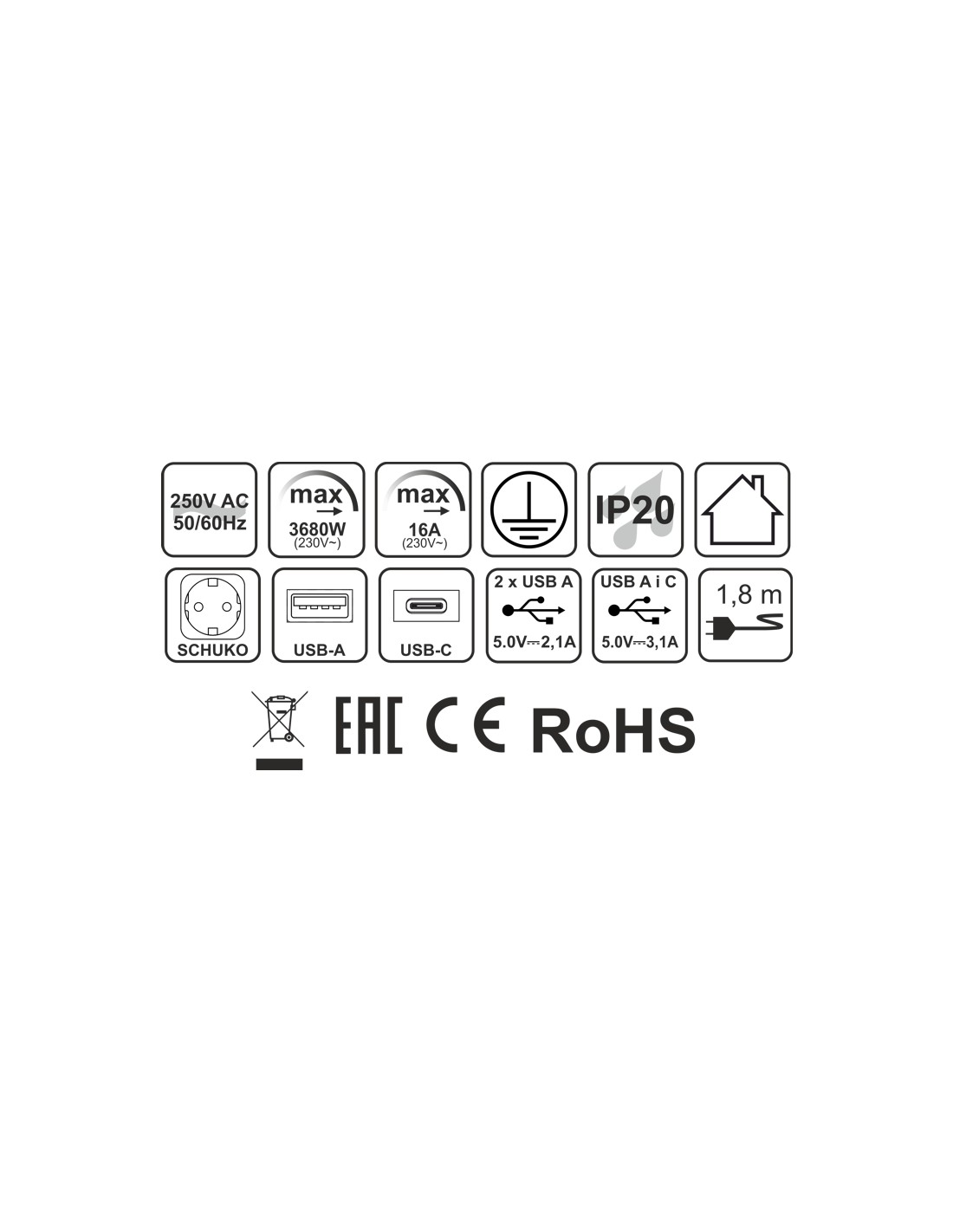 • 2 x 16A Schuko-pistorasiaa