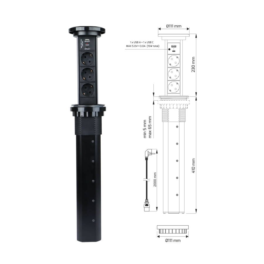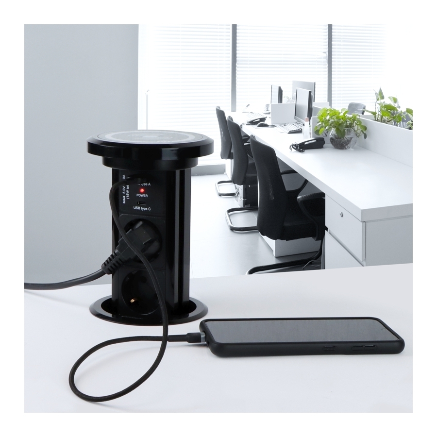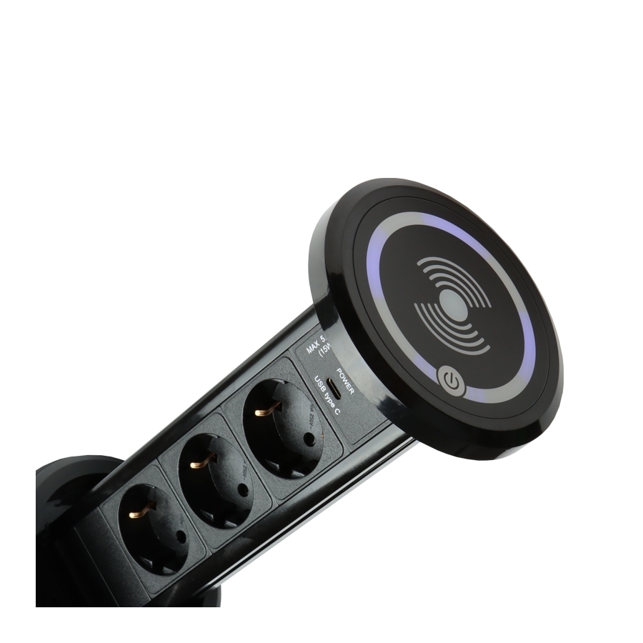Tämä tuote on äärimmäisen toiminnallinen ja upotettuna työtasoon se sulautuu saumattomasti sen pintaan. Yläosassa on integroitu induktiivinen laturi, jonka avulla voit ladata langattomasti esimerkiksi puhelimen, olipa pistorasia sisään vedetty tai ulos vedetty.