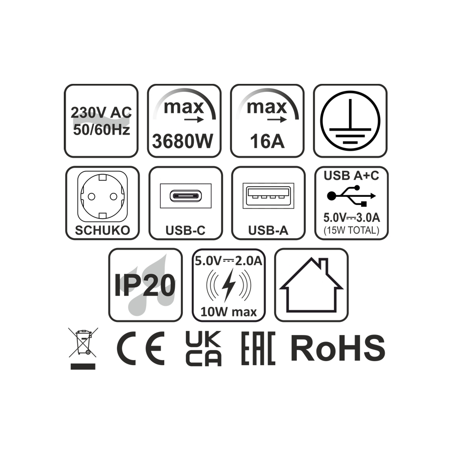 SOLINA TOUCH 3 on moderni ja käytännöllinen upotettava pistorasiayksikkö, joka voidaan asentaa keittiön tai toimiston työtasoon. Laite on saatavana mustana tai alumiininharaana ja se sisältää seuraavat liitännät: