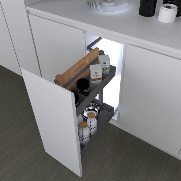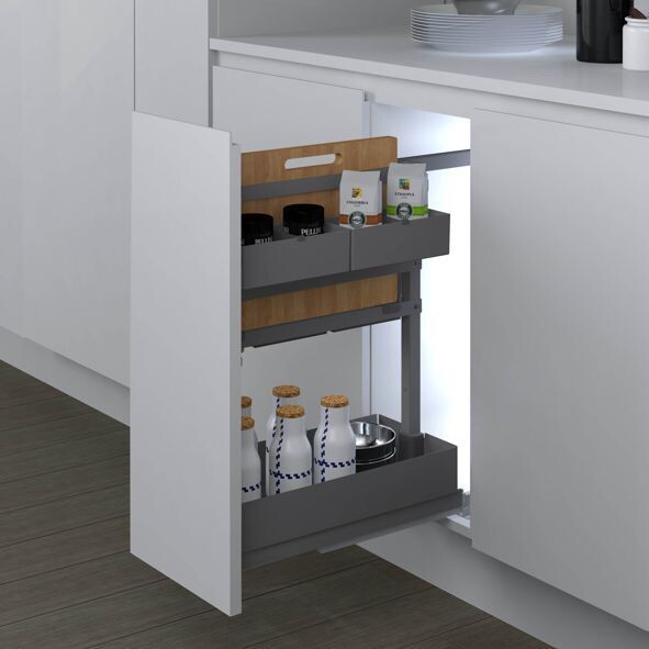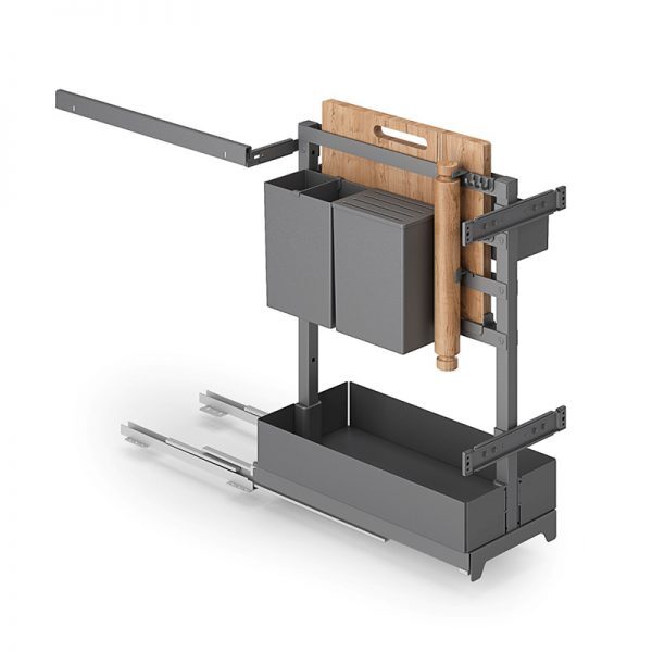 Inoxan Hyper malliston tarvikevaunu tuo tehokkuutta ja järjestystä keittiökaappiisi antrasiitin sävyisenä. Tämä laadukas tarvikevaunu on varustettu monipuolisilla ominaisuuksilla, kuten metallisivulla varustetulla hyllyllä kumimatolla, lokerikoilla, koukuilla, telineellä veitsille sekä paikalla leikkuulaudalle ja kaulimelle.