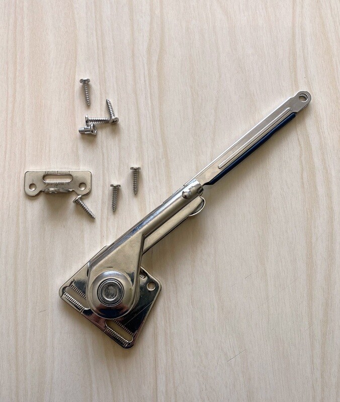 Ylänostomekanismi, joka voidaan asentaa ylöspäin aukeavaan oveen tai alaspäin aukeavaan oveen. Linkku pitää oven auki.